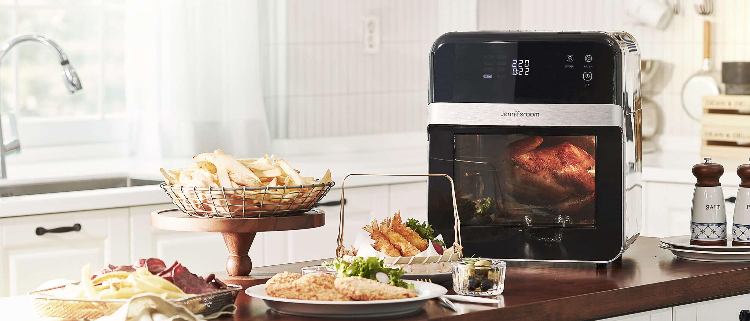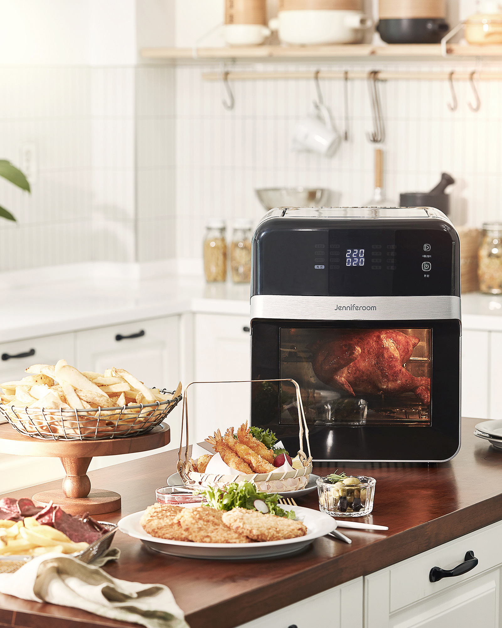 Jenniferroom Air Fryer Rotisserie Chicken Front View P-Product Pieces Product photo showing Jenniferroom air fryer with rotisserie chicken, fries, fried dishes, and olives on kitchen table, front angle.