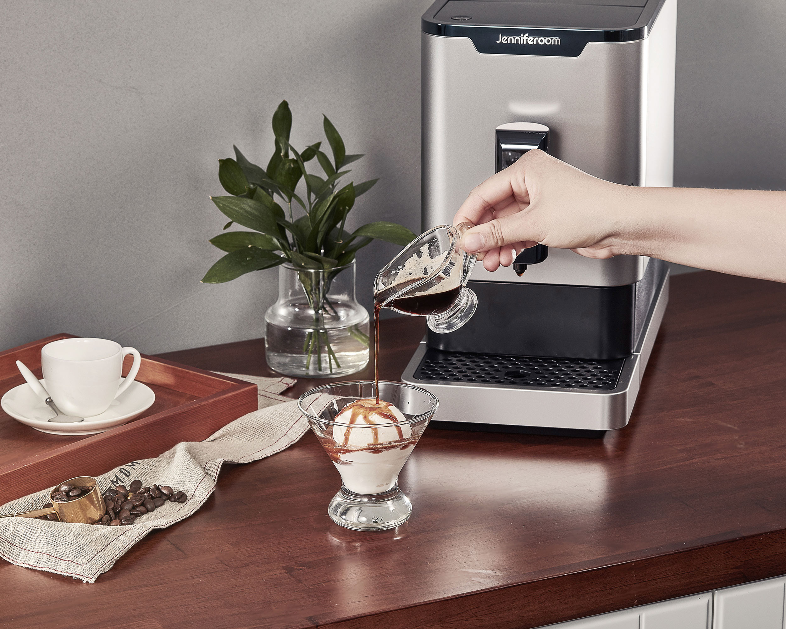 Jenniferroom Automatic Coffee Machine Affogato P-Product Pieces Product photo of Jenniferroom automatic coffee machine brewing espresso and pouring it over vanilla ice cream to make affogato.