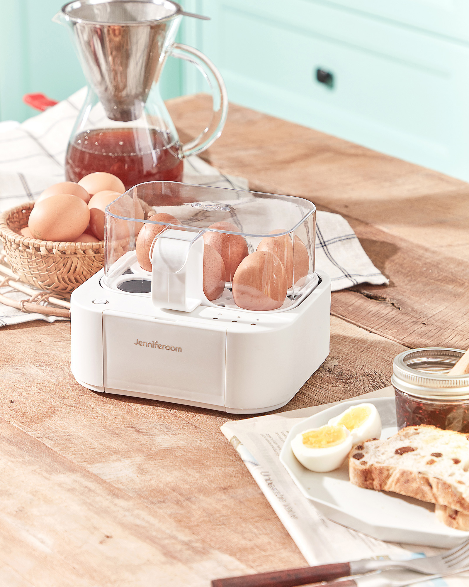 Jenniferroom Egg Boiler Close-up Breakfast Scene P-Product Pieces Close-up product photo showing Jenniferroom egg boiler with boiled eggs, bread, and jam on a breakfast table.