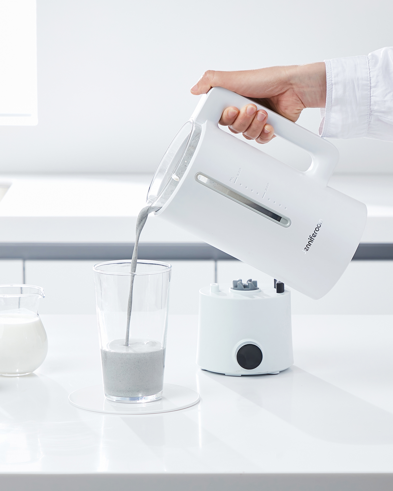 Jenniferroom Electric Kettle Serving Drink P-Product Pieces Lifestyle kitchen photo showing a white Jenniferroom electric kettle serving beverage into a glass for a fresh, clean look.