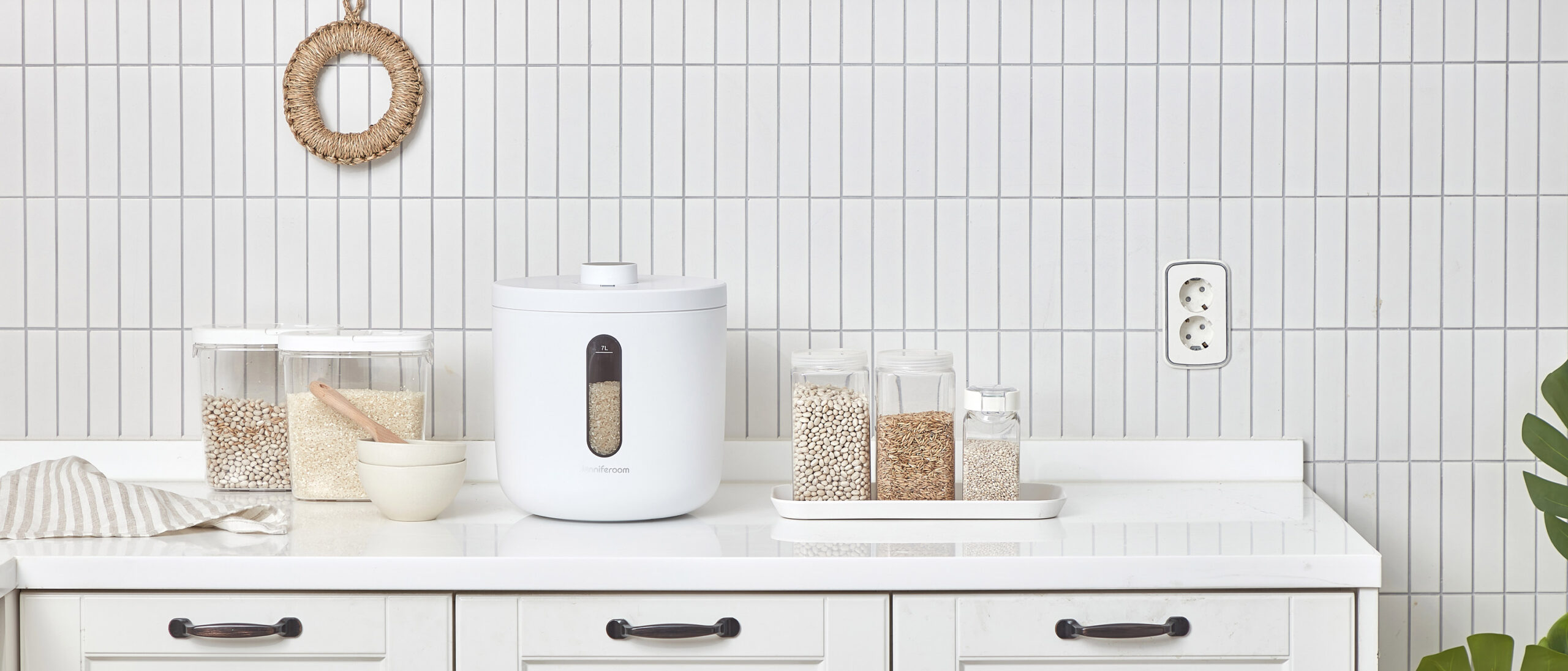 Jenniferroom Rice Container Open Scene P-Product Pieces Lifestyle product photo of opening the white Jenniferroom rice container with rice and kitchen props arranged in a clean kitchen setting.