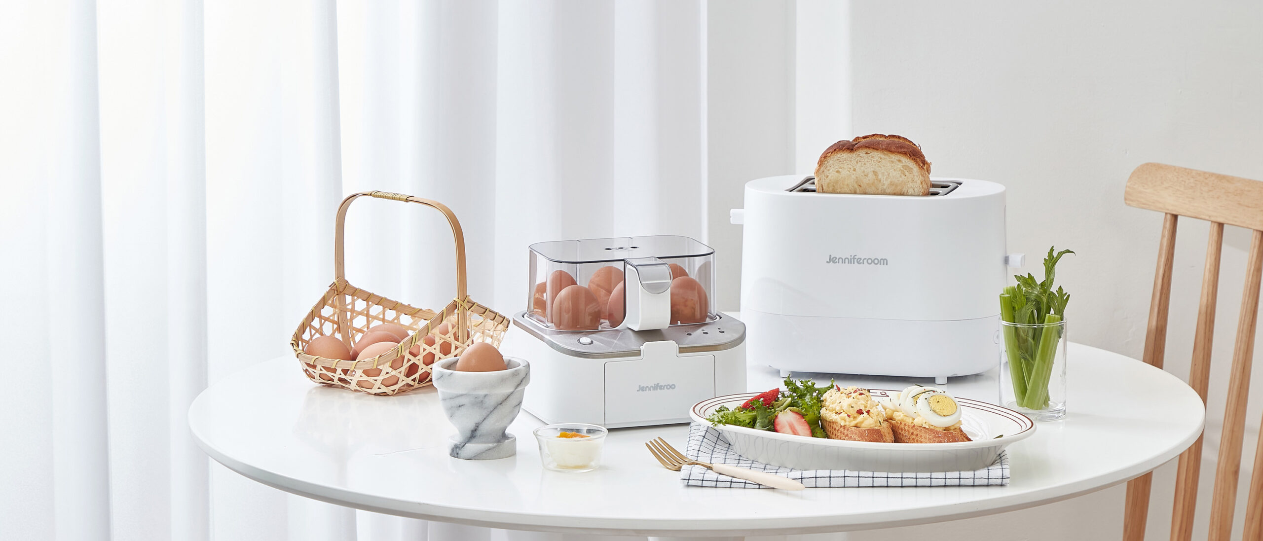 Jenniferroom White Toaster Egg Cooker Breakfast P-Product Pieces Commercial lifestyle photography of Jenniferroom white toaster and egg cooker with boiled eggs, salad, and toast, styled as a fresh brunch table.