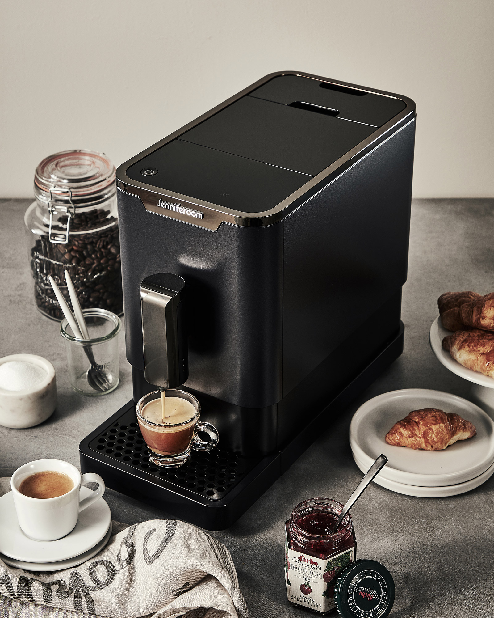 Jenniferroom Coffee Machine Espresso with Croissant Breakfast P-Product Pieces Breakfast scene with espresso from Jenniferroom coffee machine, croissants, and jam