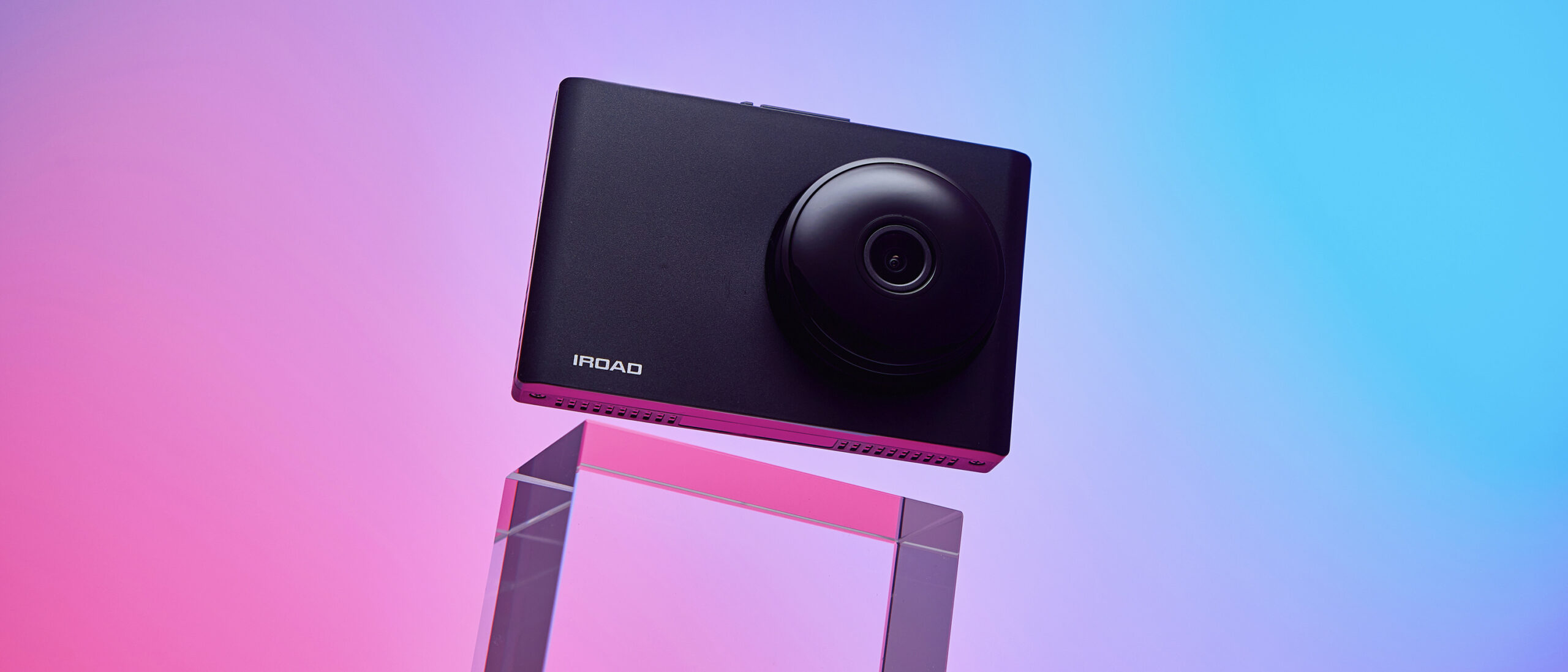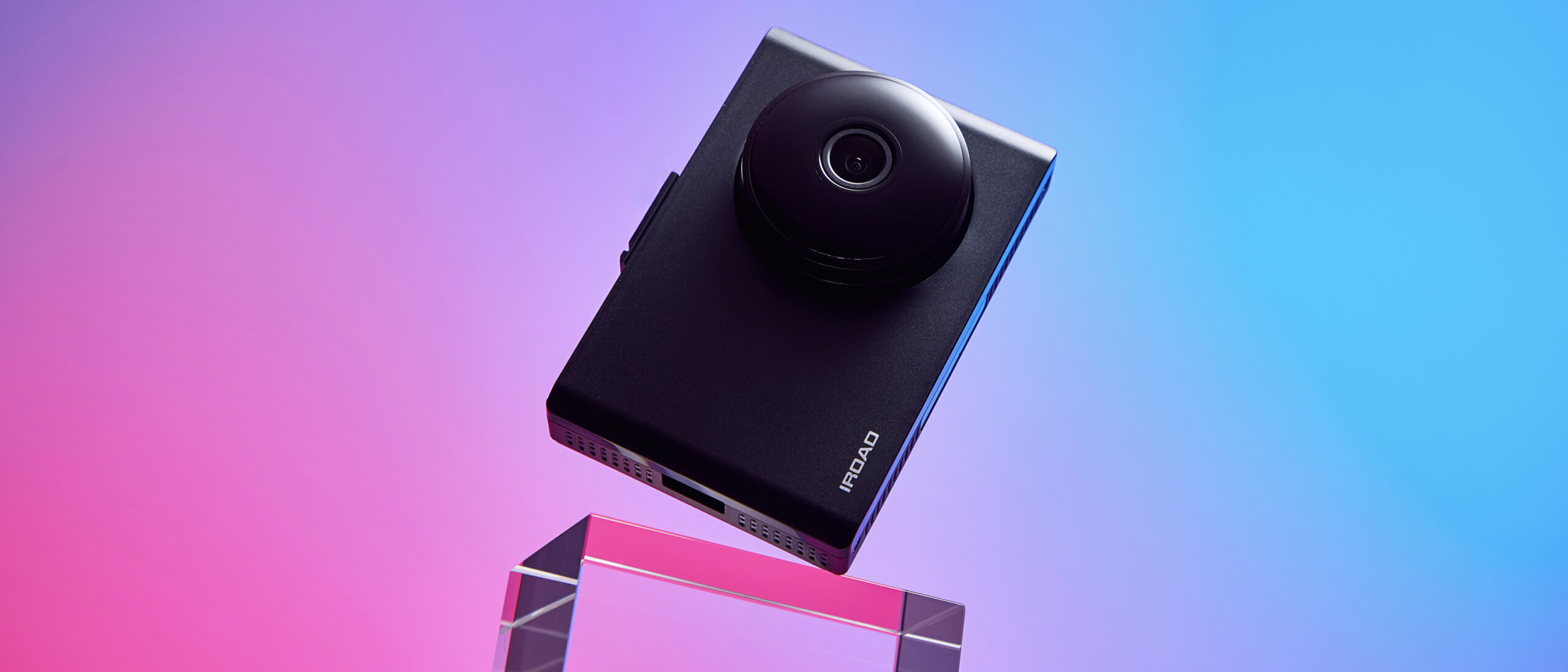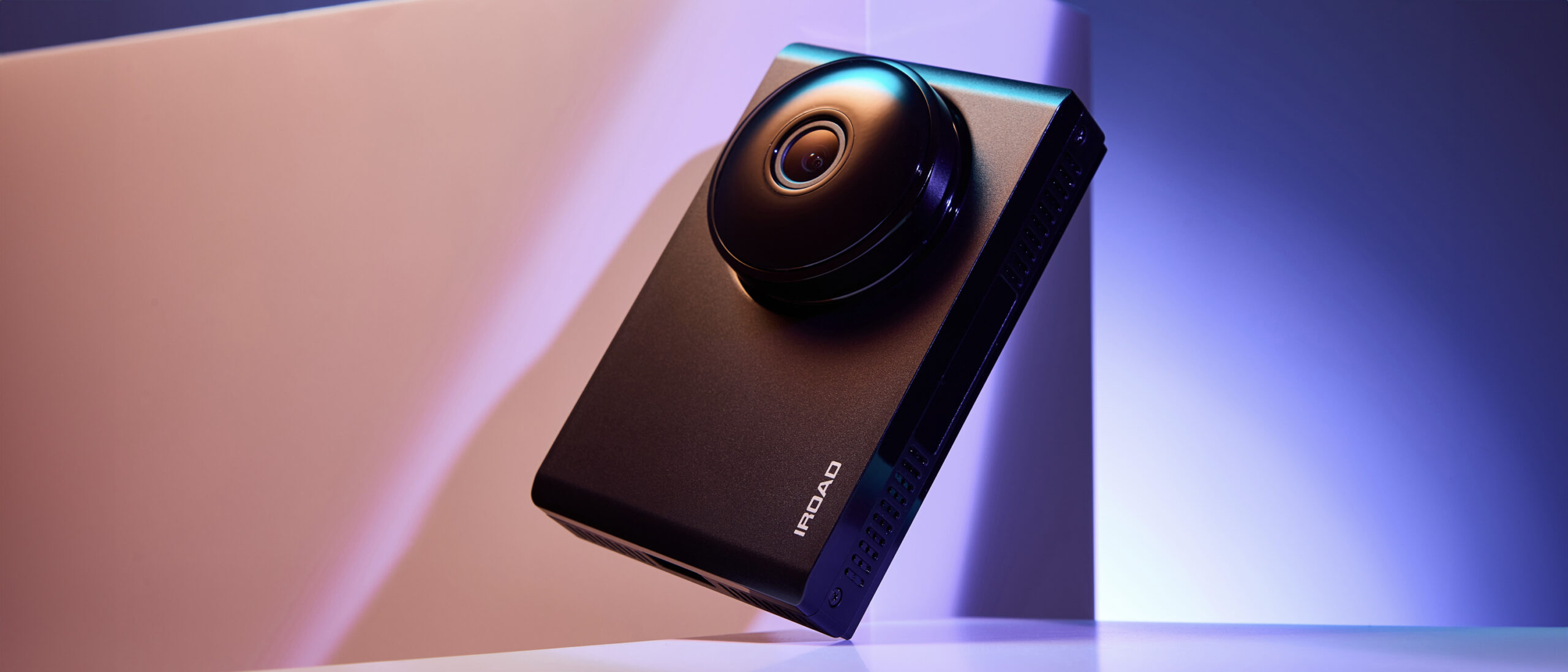 IROAD Dashcam Product Shot – Blue and Pink Lighting P-Product Pieces A modern product photo of the IROAD dashcam with blue and pink lighting to emphasize its design