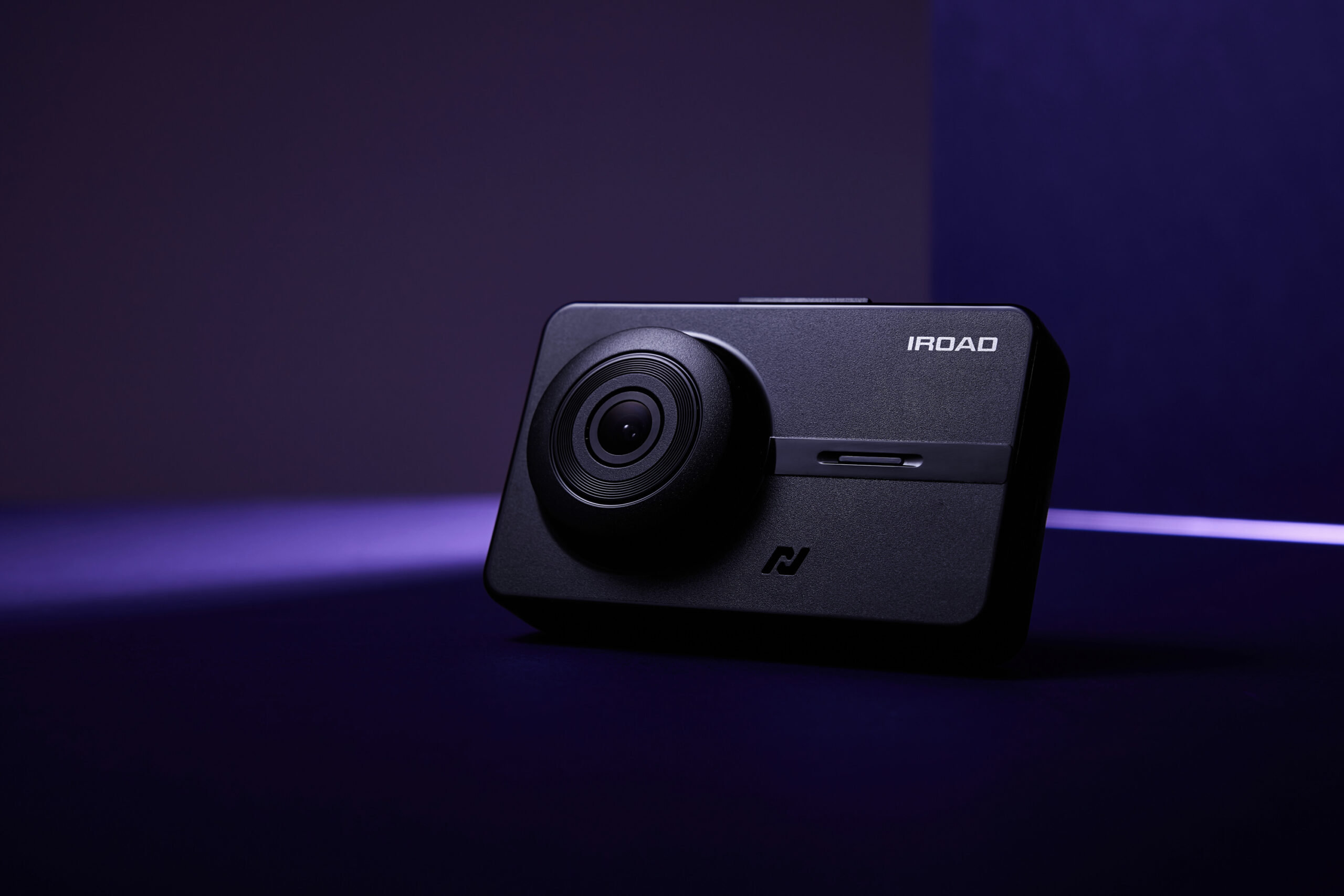 iroad NX1000 dashcam with colorful lighting P-Product Pieces A sleek iroad NX1000 dashcam product photo with purple, pink, and blue lighting