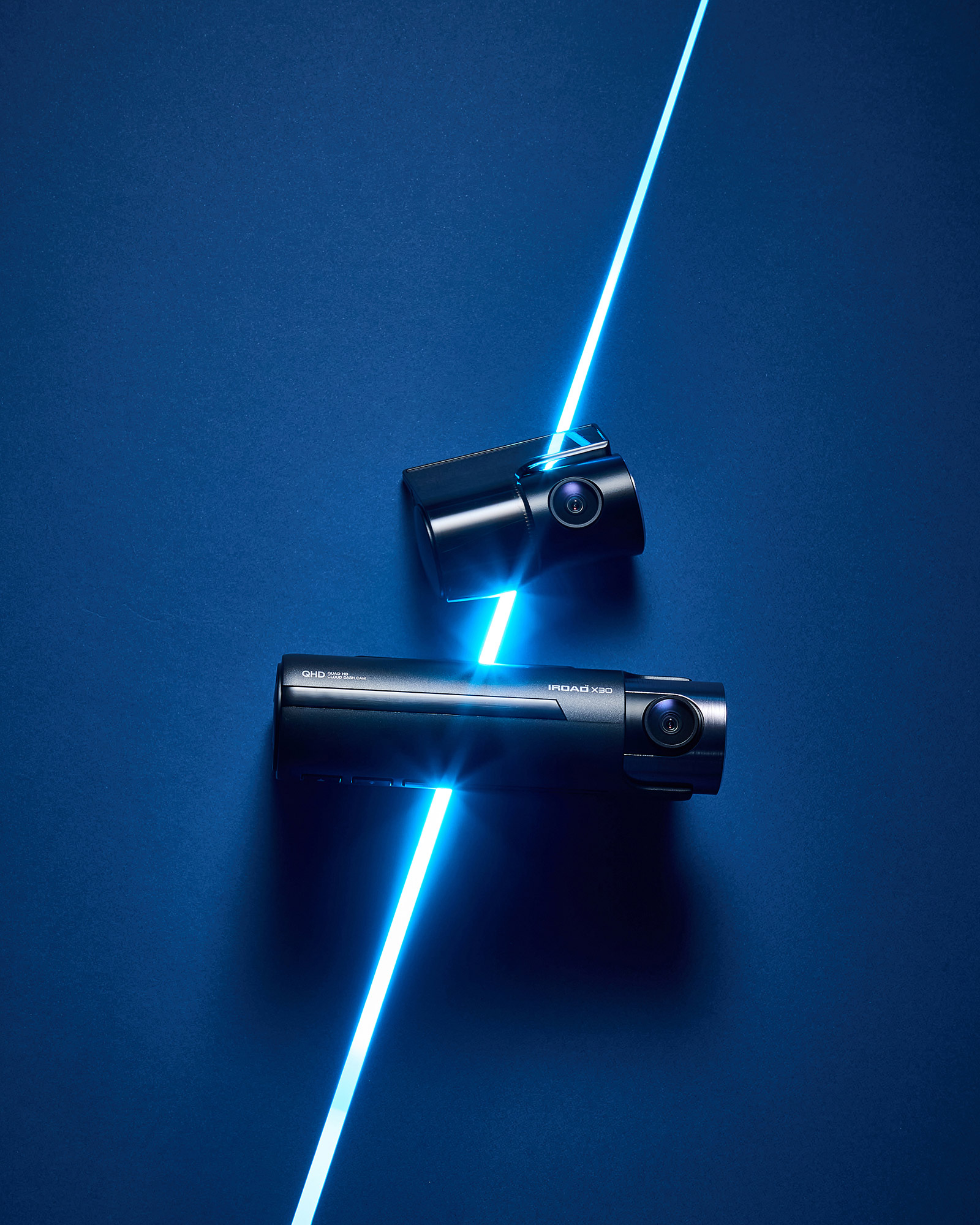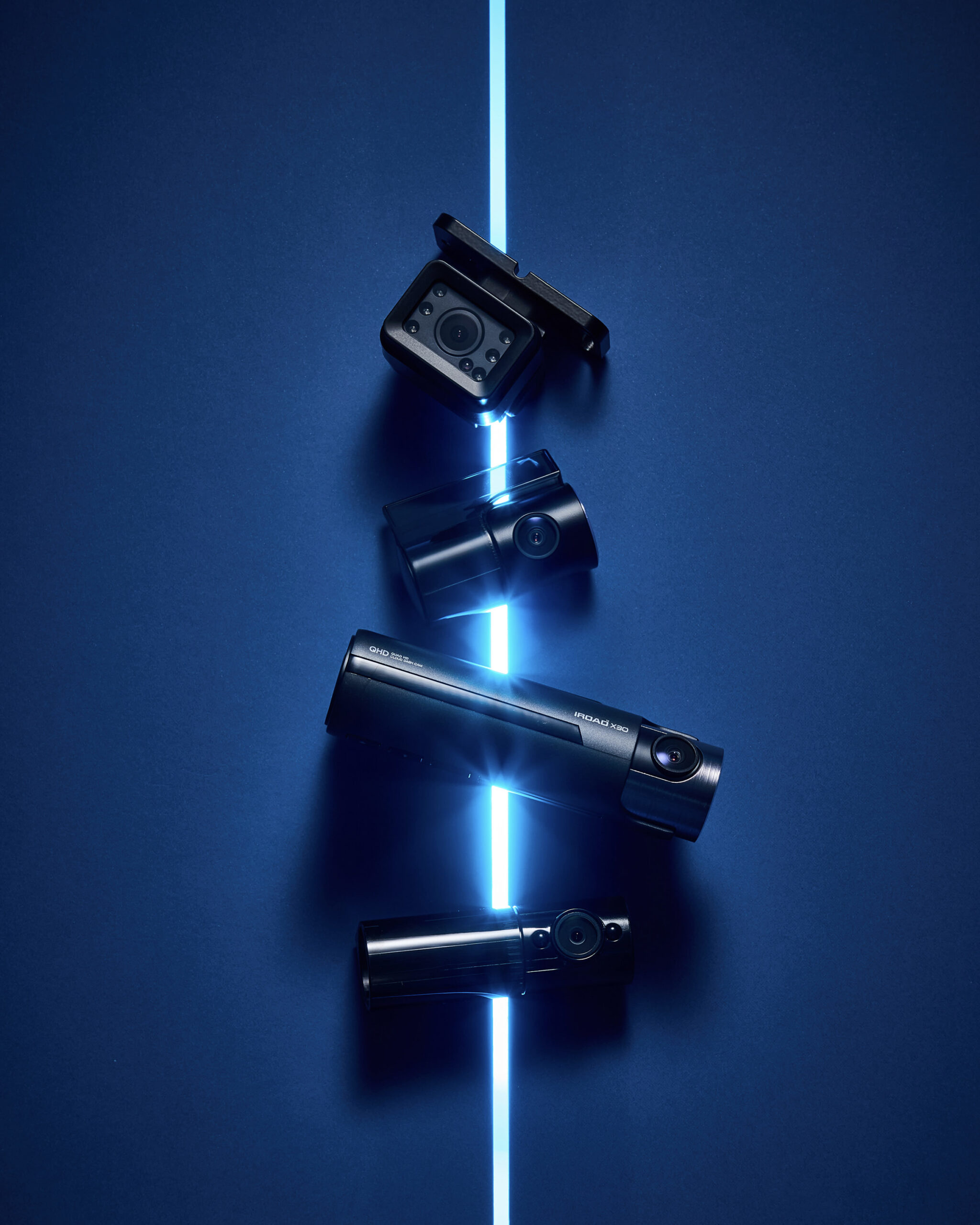 IROAD X300 Dual Camera Product Photo P-Product Pieces Professional studio advertising photo of IROAD X300 dual camera, captured with blue lighting to highlight sleek design and modern aesthetic.