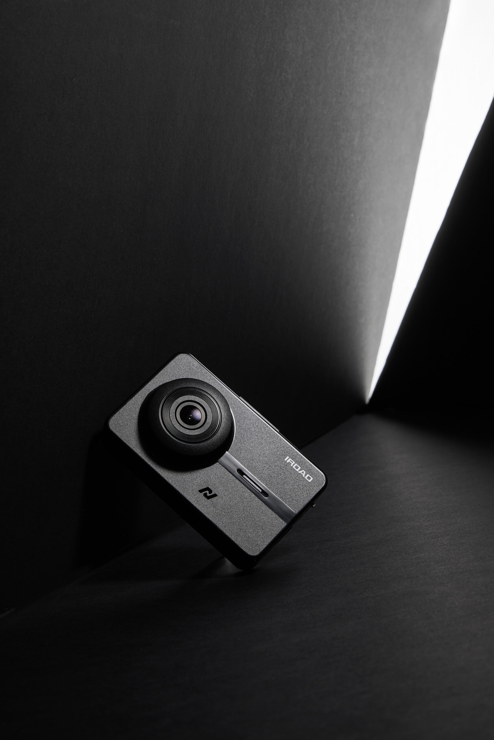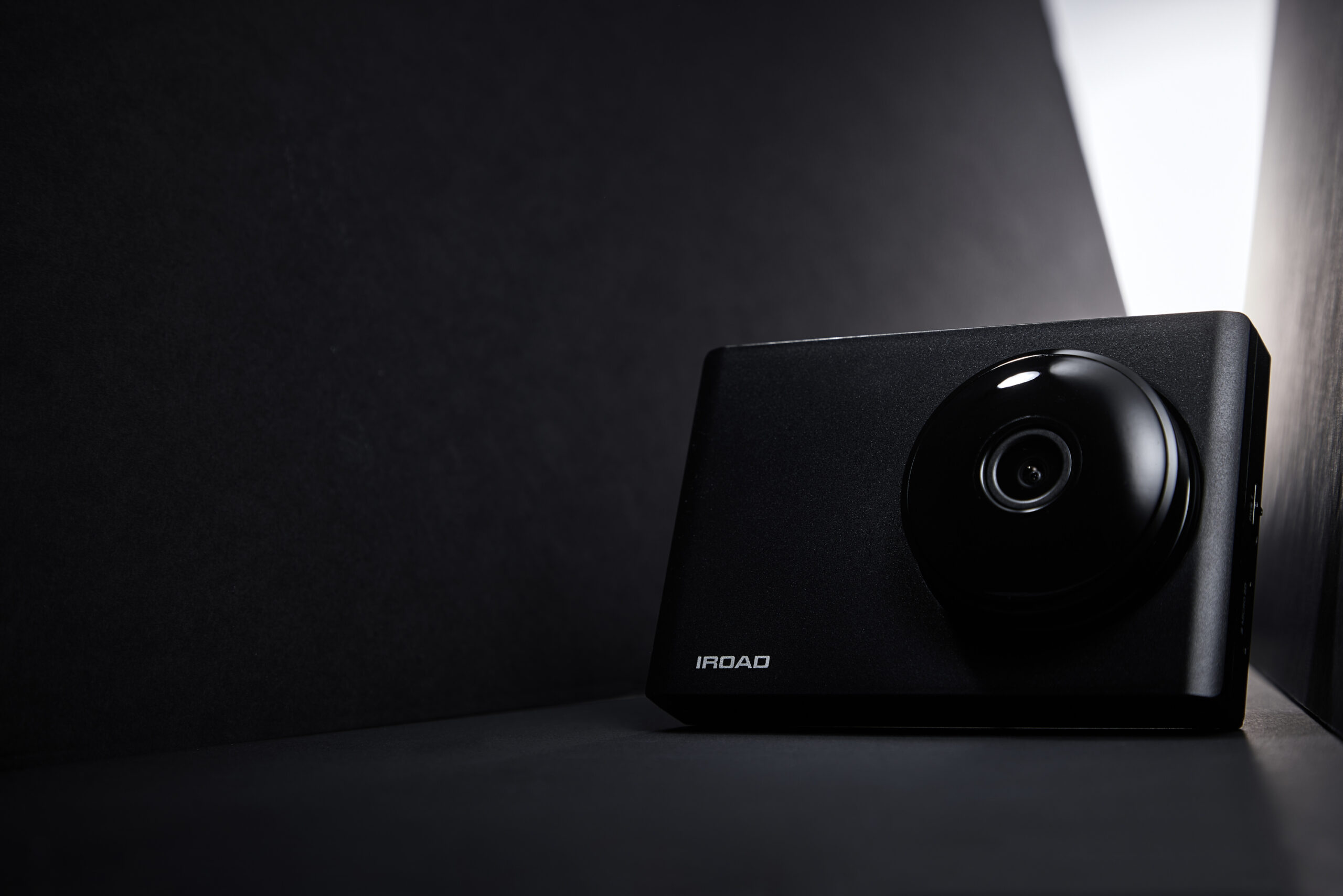 IROAD Blackbox Product Photo – Sleek Design Highlighted with Strong Light in Dark Minimal Setting P-Product Pieces A sleek IROAD Blackbox product photo presented in a dark setting with strong light contrast to highlight its elegant design.