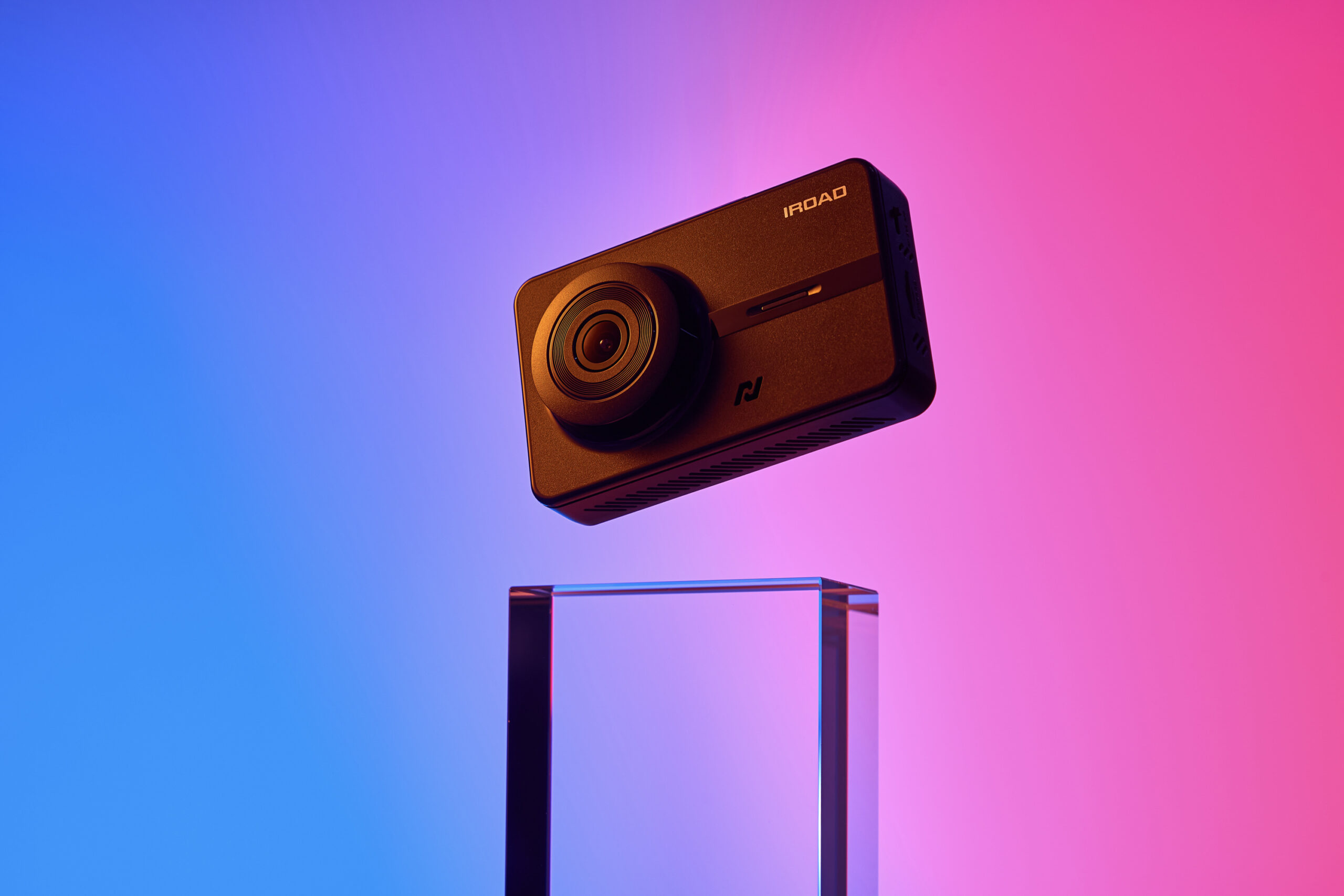 IROAD Dashcam Product Photo P-Product Pieces Premium studio product photo of IROAD dashcam with colorful lighting, showcasing its sleek design and modern aesthetic appeal.