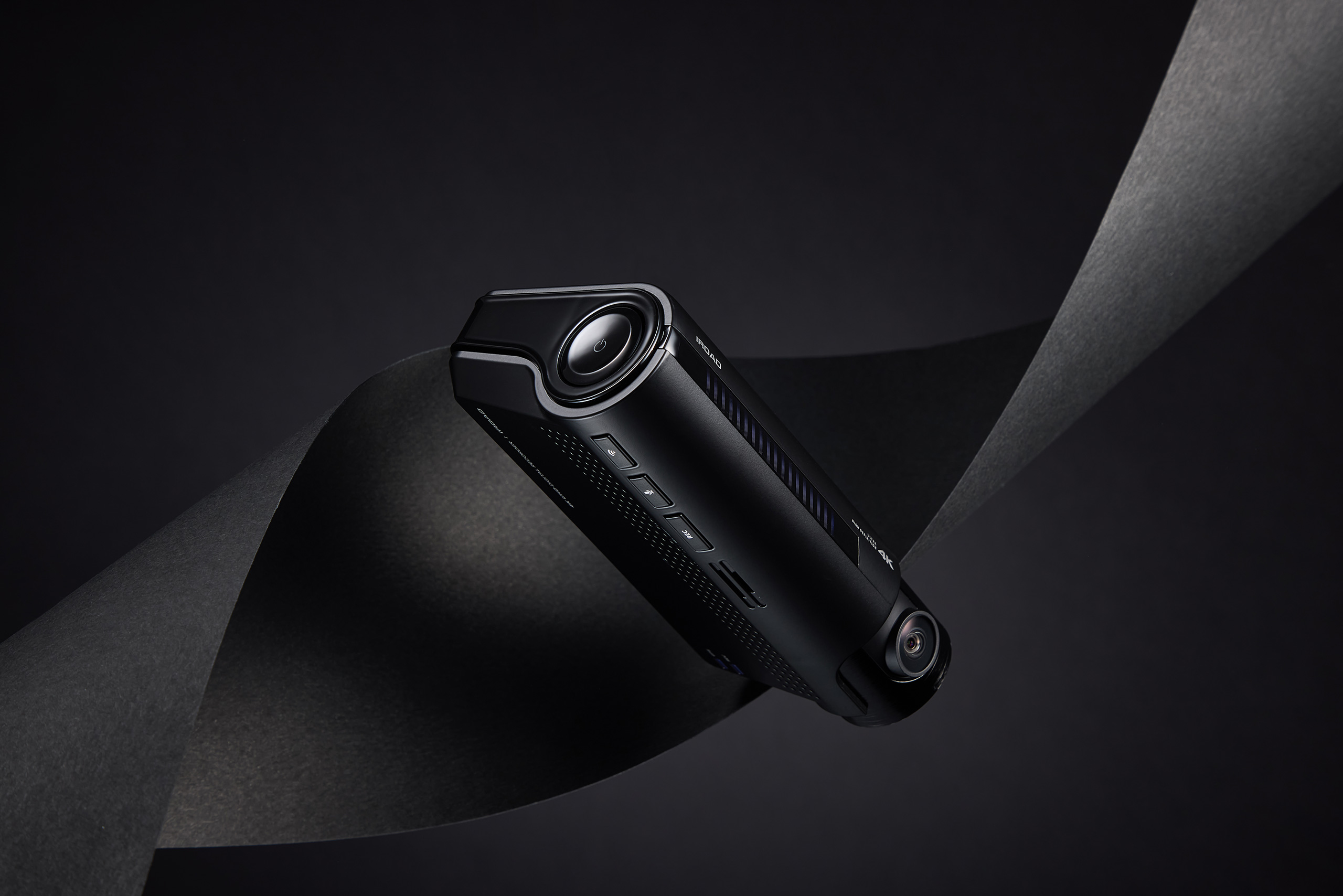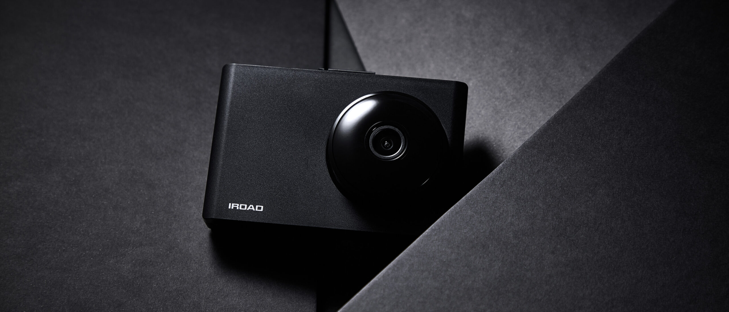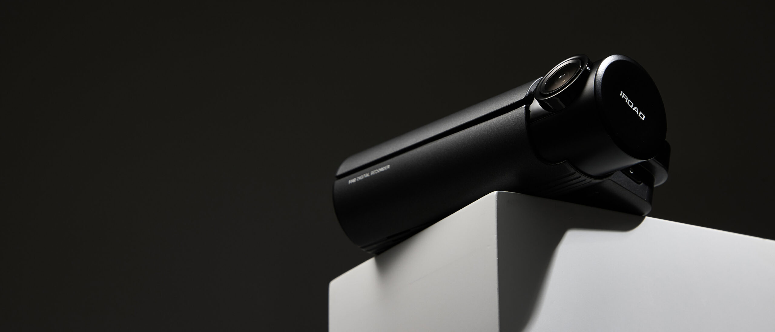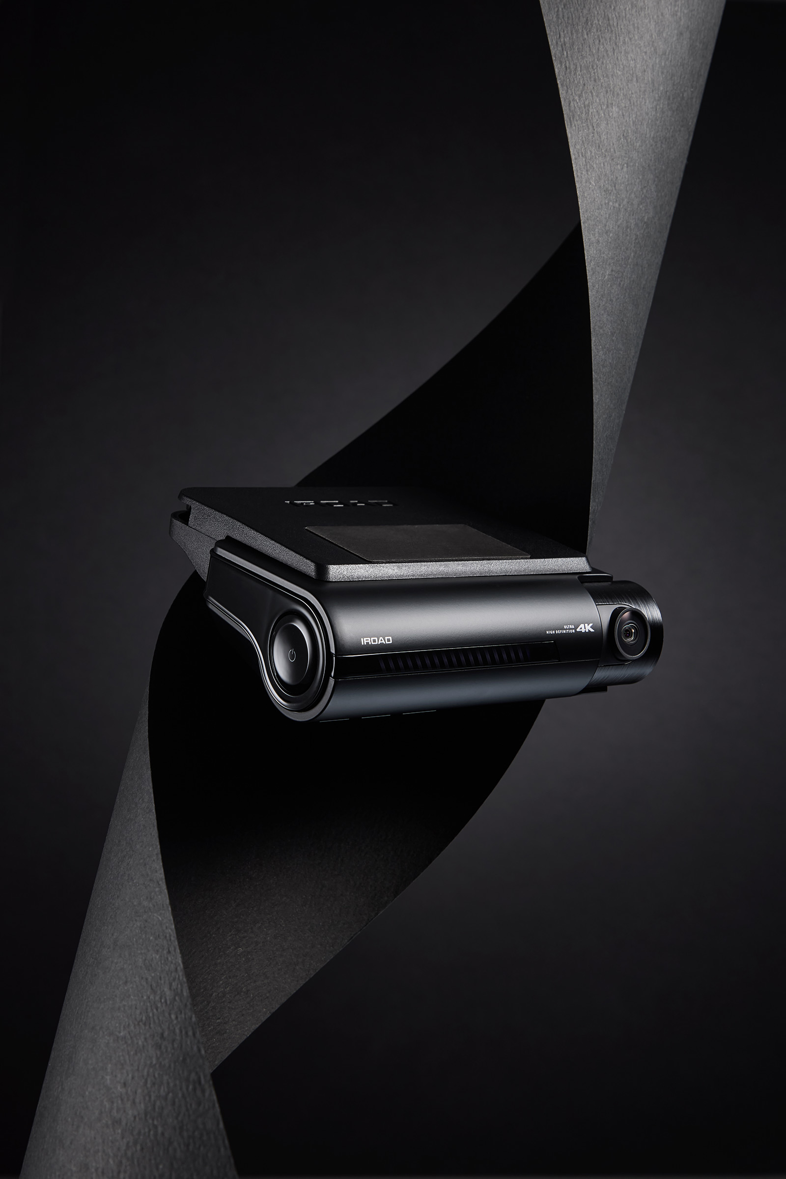 IROAD Dashcam Product Photo P-Product Pieces Premium advertising photo of IROAD dashcam on black background, emphasizing sleek design and modern visual appeal
