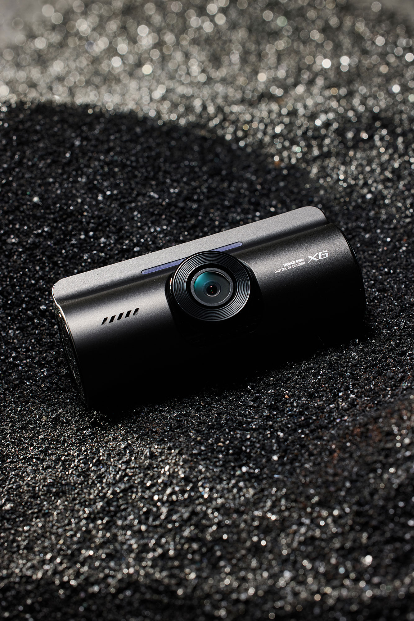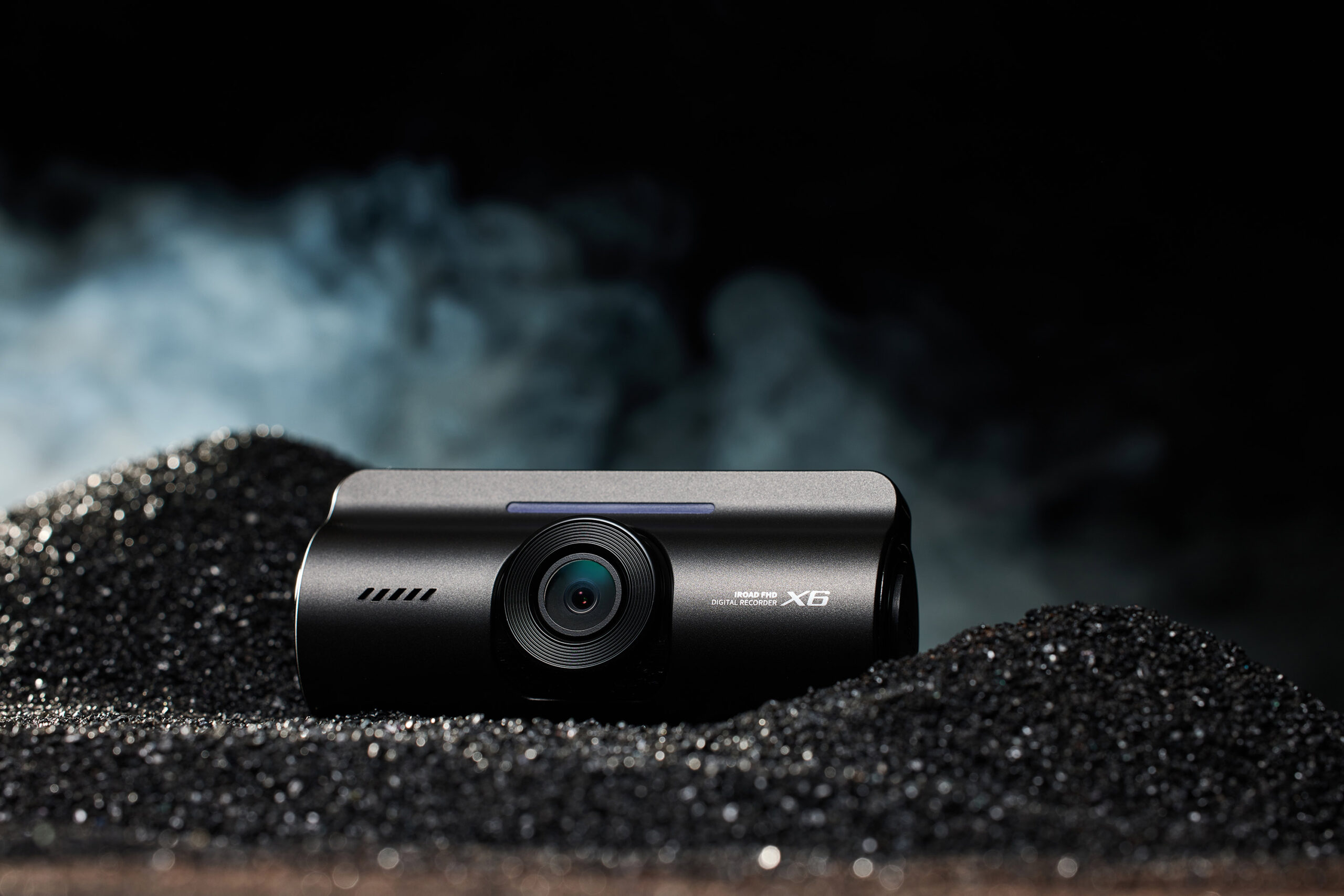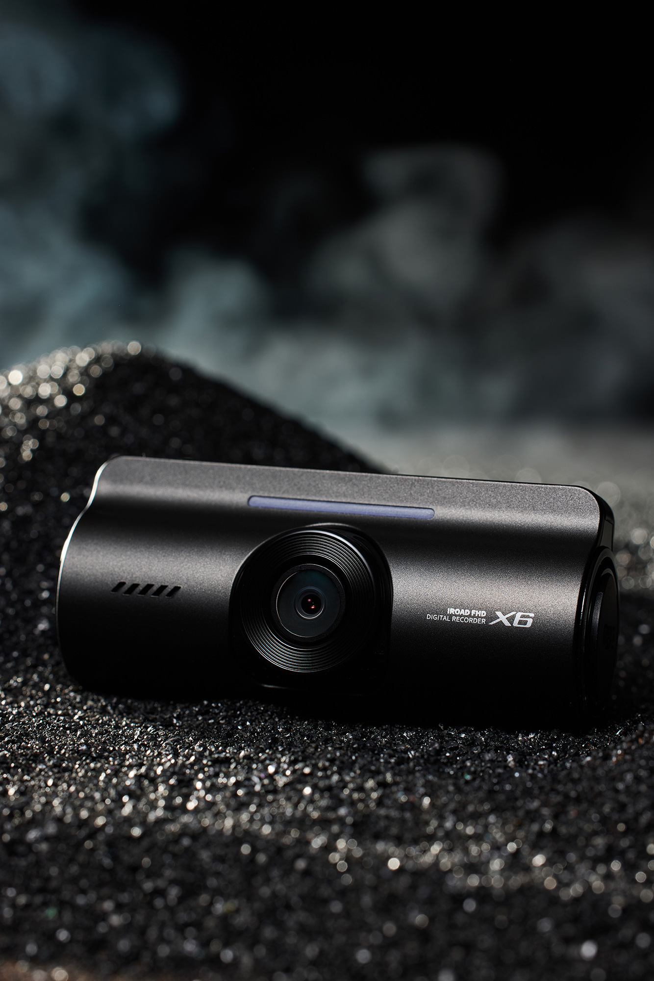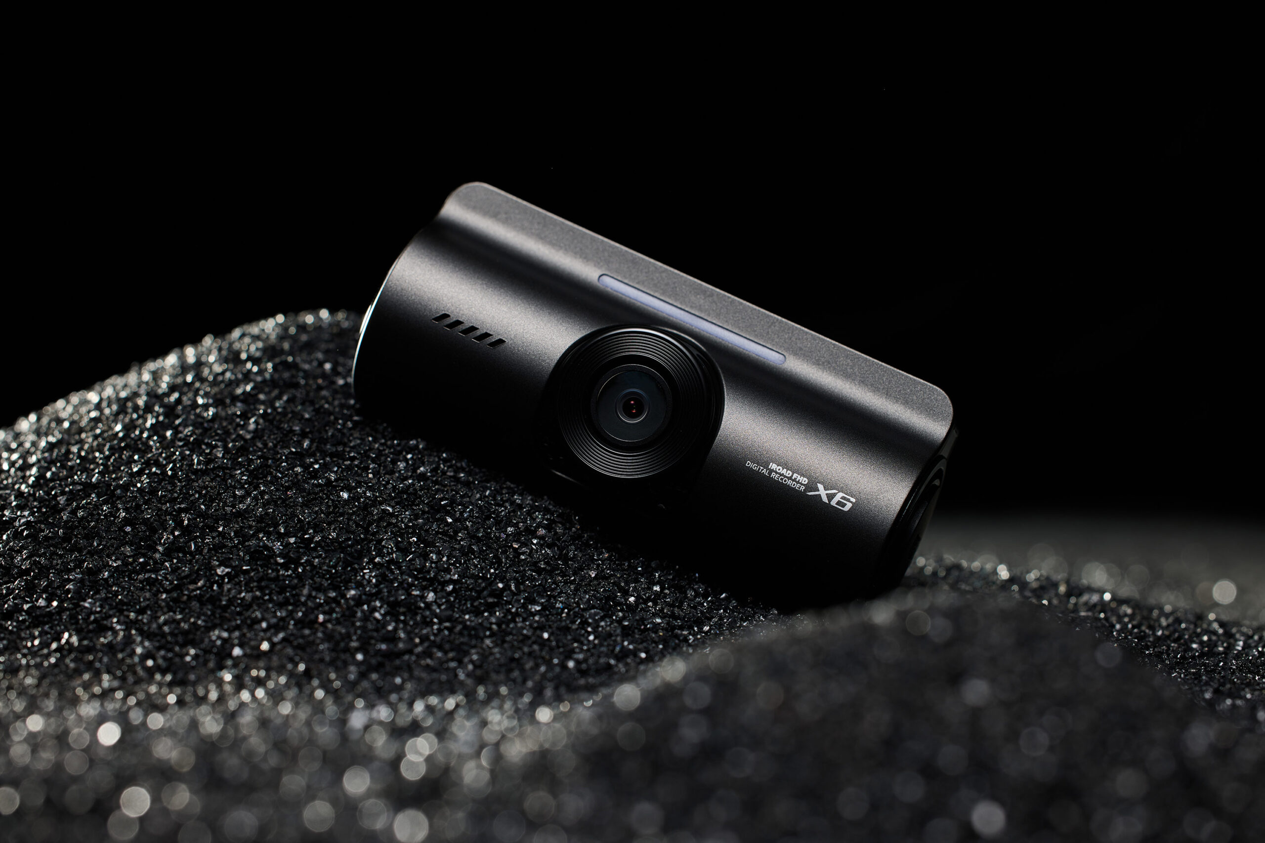 IROAD X6 Dashcam Product Photo P-Product Pieces Premium studio shot of IROAD X6 dashcam on a refined black sand texture, highlighting its sleek design and modern appeal.