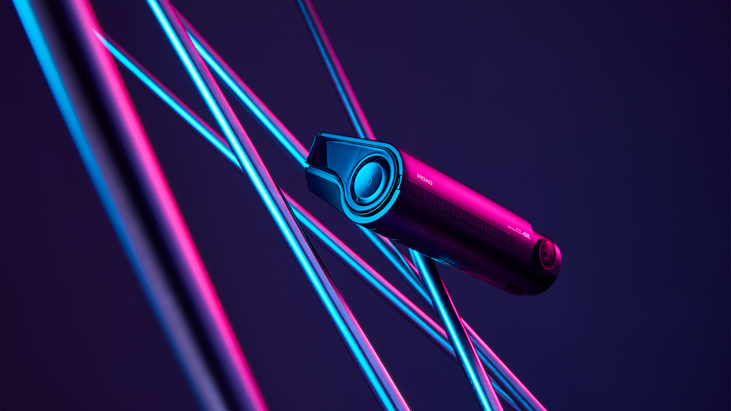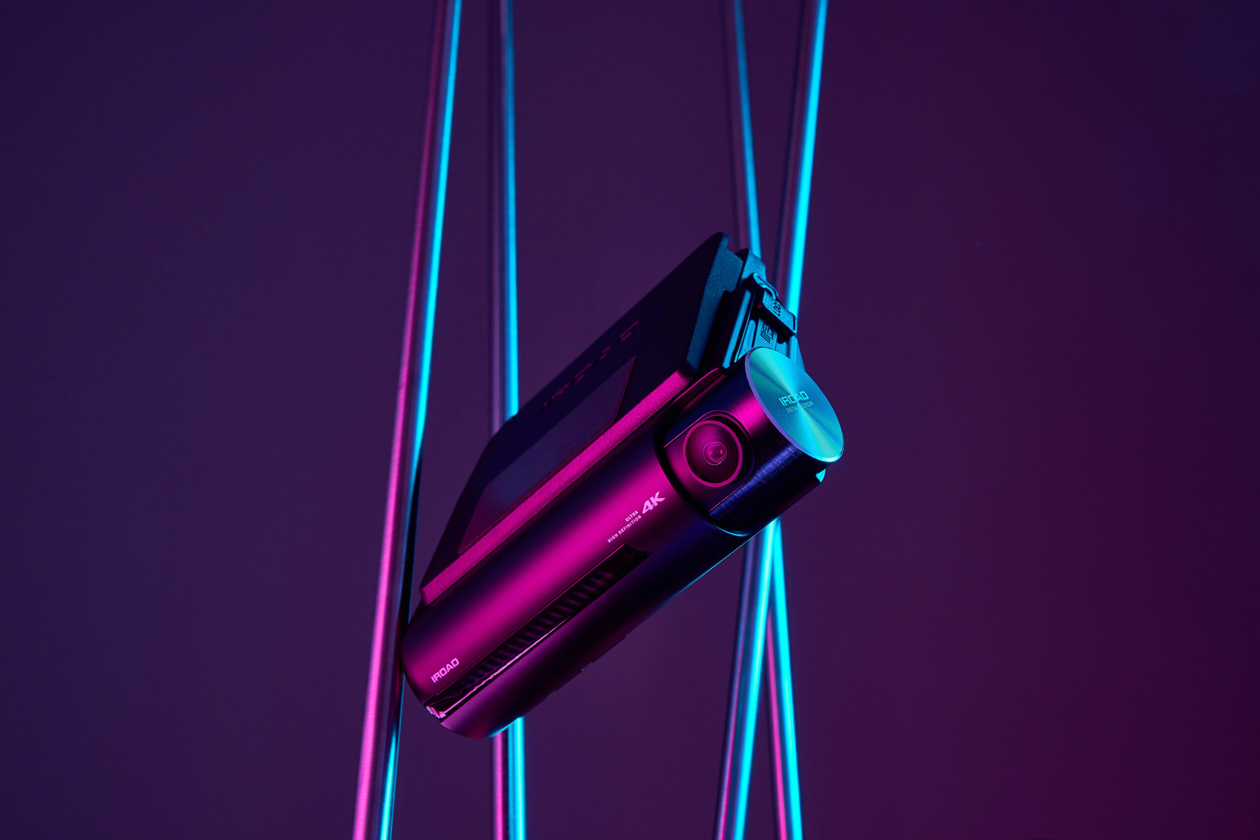 IROAD dashcam shoot – sleek product image under neon lights P-Product Pieces Stylish product photo of IROAD dashcam under neon lights, expressing modern and sophisticated atmosphere.