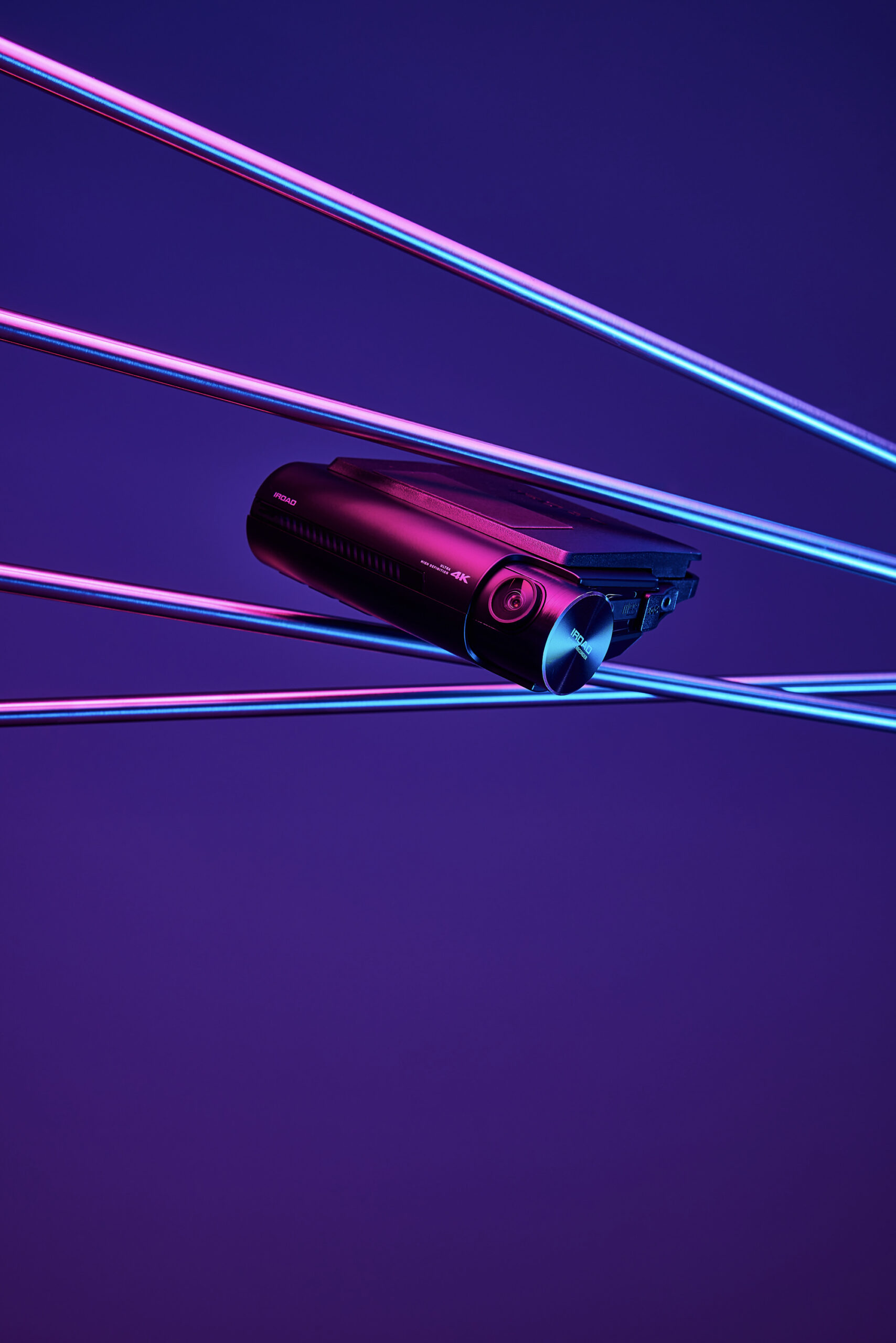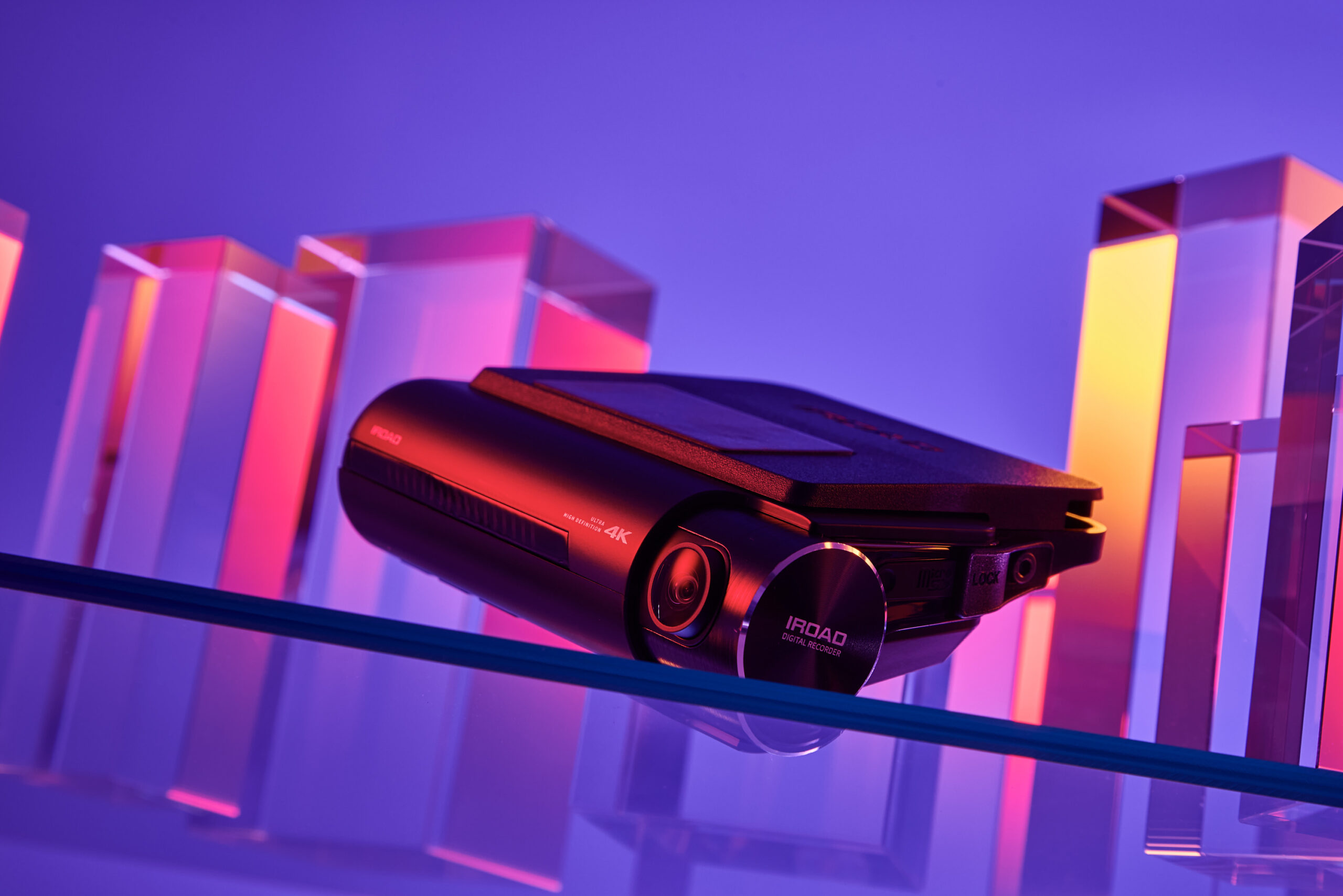 IROAD Blackbox Product Shot – Modern Lighting Style P-Product Pieces A dashcam product photo of IROAD shot with colorful lighting gels, creating a modern and refined atmosphere that emphasizes brand identity