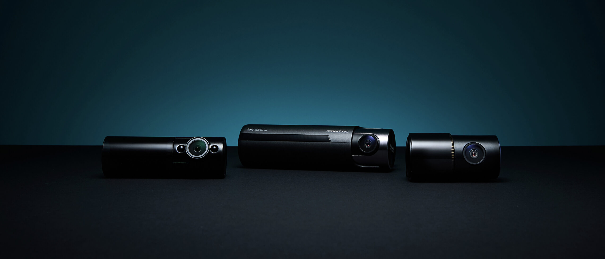 IROAD X300 Dashcam Product Lineup P-Product Pieces Professional advertising photo featuring three IROAD X300 dashcam models in a lineup, emphasizing reliability and sleek design with clean studio lighting.
