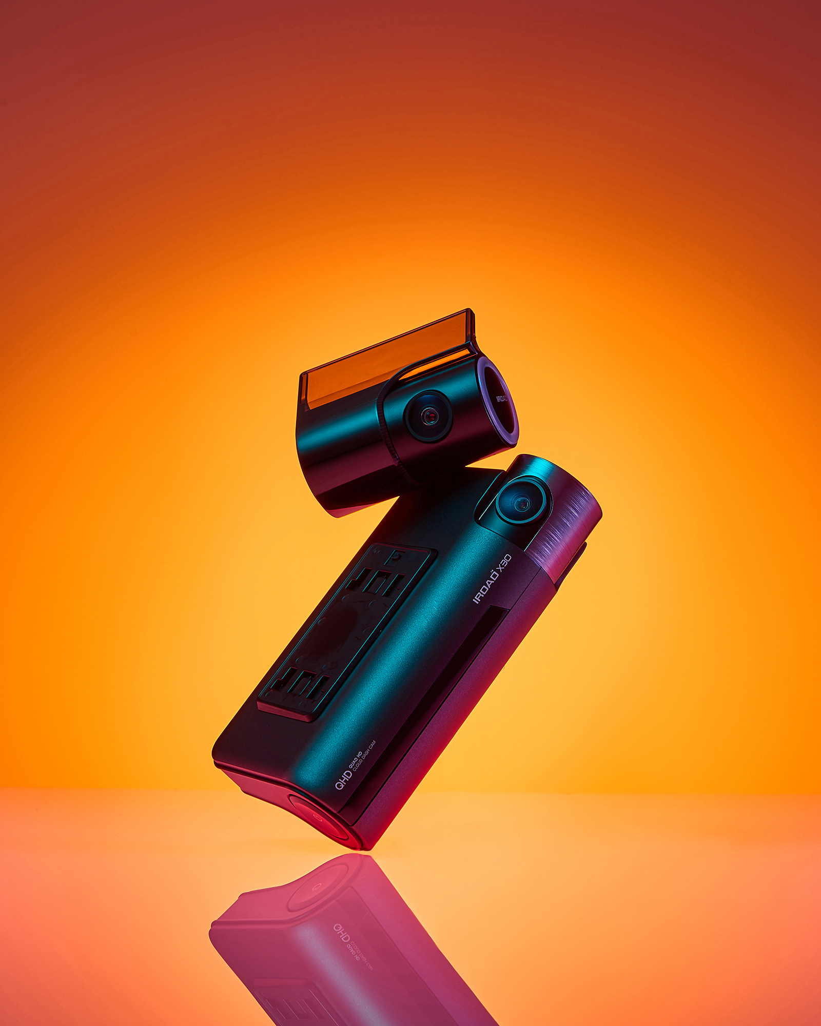 IROAD X300 Dashcam Photo P-Product Pieces Premium advertising photo of IROAD X300 dashcam, highlighted with orange lighting and reflection to emphasize its modern design and luxurious appeal
